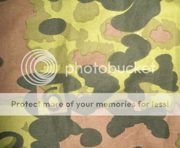 Production of the original Platanen pattern seems to have ended by 1941, and the Eich-Platanen by 1941, perhaps because it was uneconomically time-consuming. Thrifty manufacturers continued using up surplus cloth in this pattern, however, probably till late 1944. Late RB-numbered Eichenlaub-pattern Zeltbahnen exist with “autumn” reverse side edging made of Platanen pattern cloth printed (for economy?) on one side only - the hidden interior was left in natural white, detectable today in damaged examples. There are also plausible reports of “autumn” Platanenmuster smocks and helmet covers left in natural white on the other side.